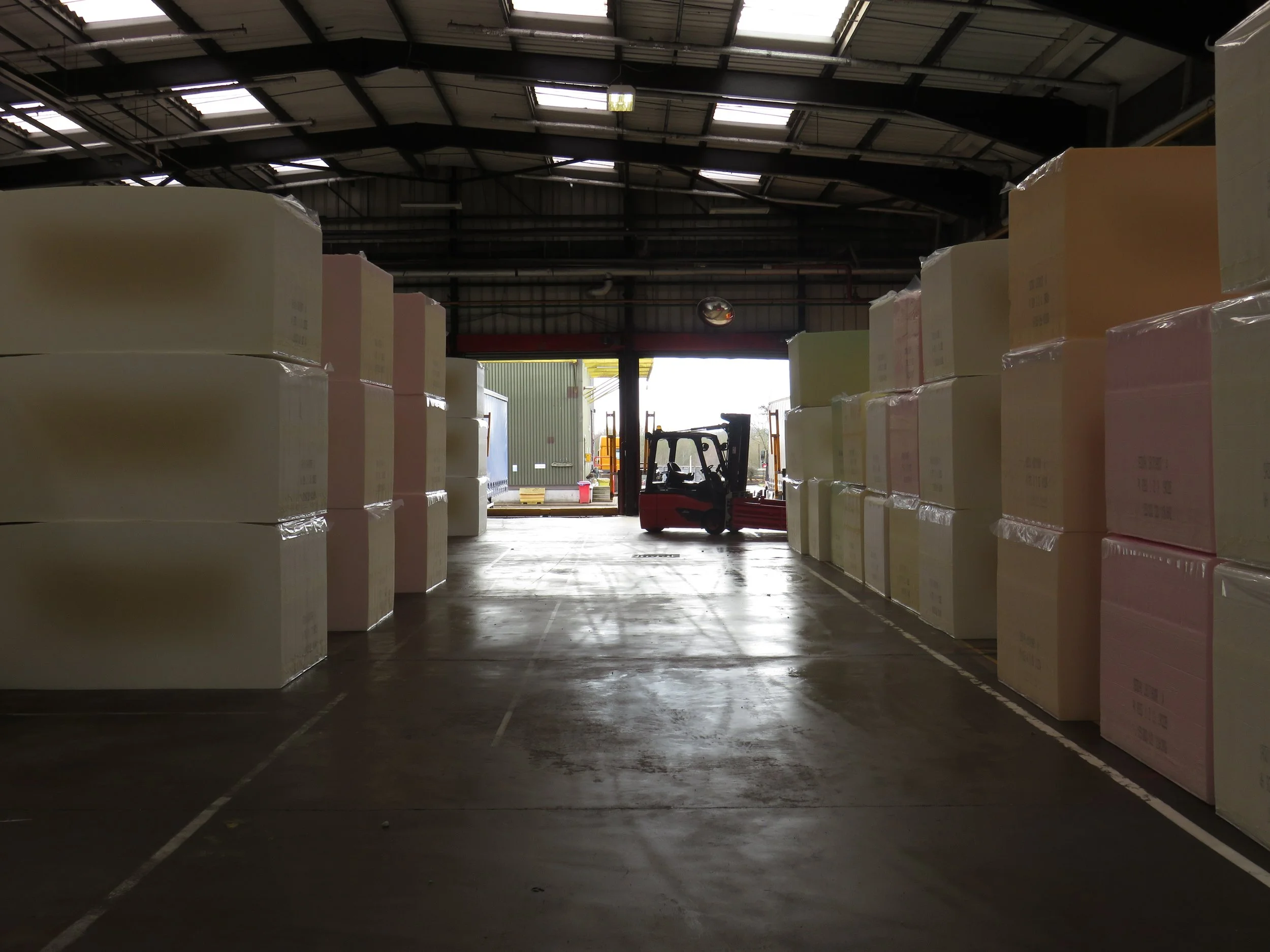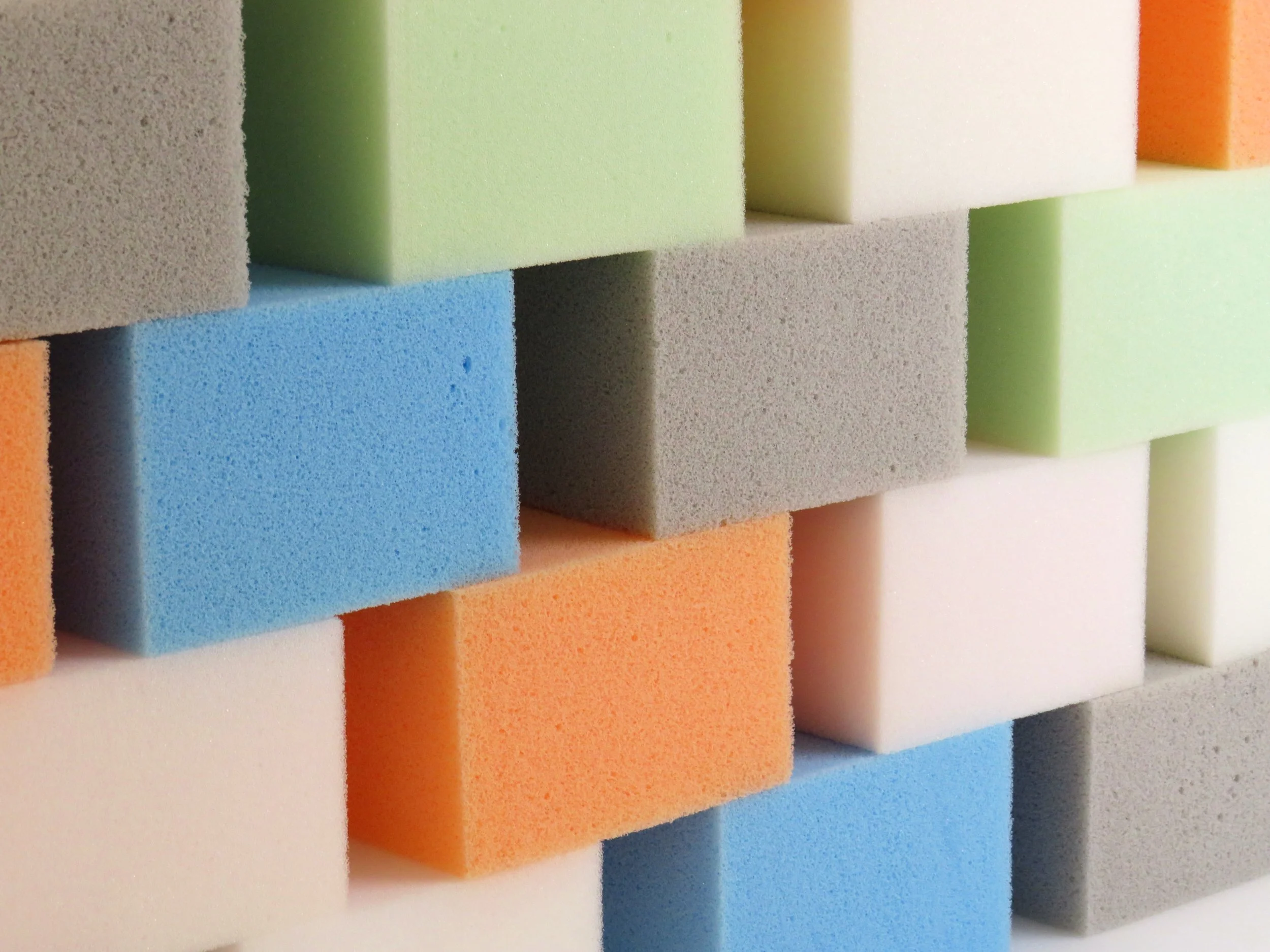 Close-up of colourful upholstery foam stacked in rows, including white, pink, orange, blue, grey, and light green pieces.